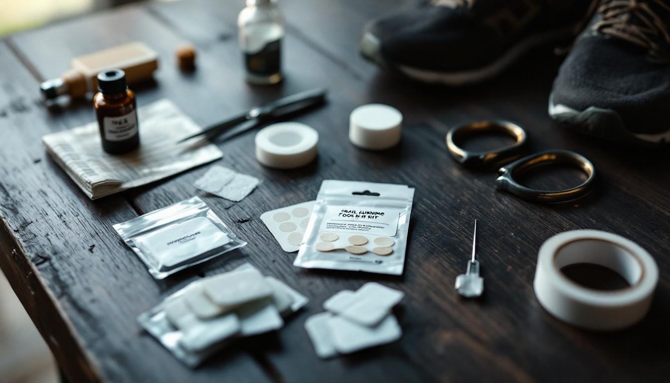 Le kit ampoules tient dans une pochette de la taille d'un paquet de gels. Aiguille stérile emballée individuellement, compresses alcoolisées, pansements hydrocolloïdes type Compeed, tape micropore en largeur 2,5 cm, mini-flacon de Bétadine dermique, ciseaux courbes. Rien de plus. Certains y ajoutent une lime carton pour un ongle qui se soulève.