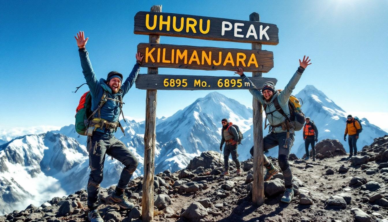 Three runners celebrating at the wooden Uhuru Peak summit sign of Mount Kilimanjaro at 5895 meters, glacier walls visibl