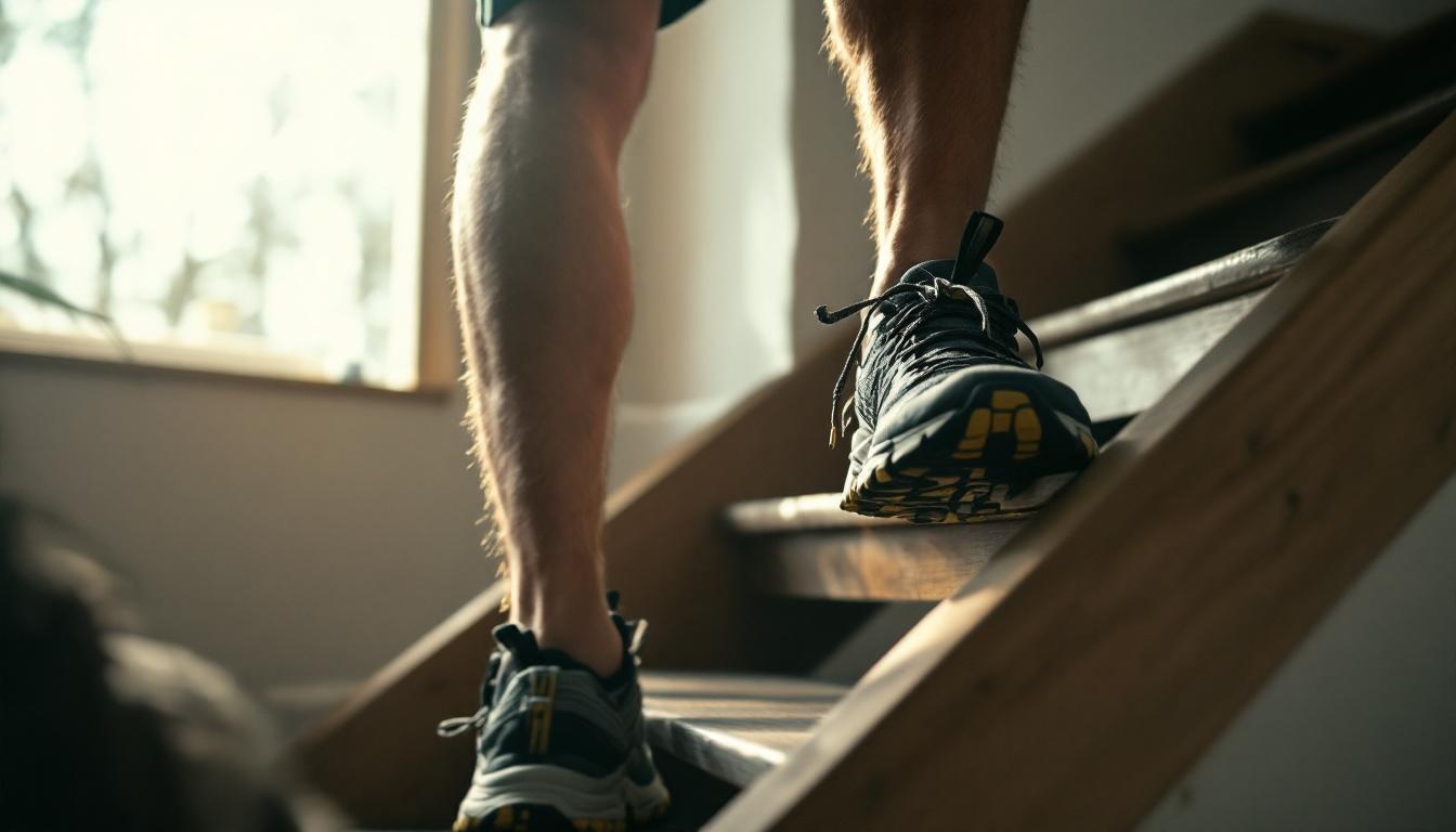 Le calf raise excentrique en descente de marche règle ce point. Montée sur deux jambes, descente lente sur une seule, sur trois à cinq secondes, amplitude maximale talon sous le niveau de la marche. 3 séries de 12 à 15 répétitions par jambe suffisent. C'est aussi, selon les recommandations de rééducation utilisées dans les manuels de médecine du sport type Brukner and Khan, le protocole de référence pour la prévention et la prise en charge des tendinopathies d'Achille — à adapter évidemment avec un professionnel de santé en cas de douleur.